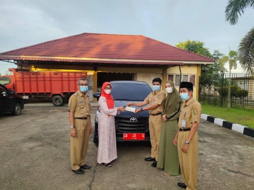 Bupati Kuantan Singingi Drs. H. Mursini, M.Si menyerahkan Mobil Dinas BM 1 K kepada Plh Sekda Kuantan Singingi di Rumah Dinas Bupati Kuantan Singingi pada sore hari Senin di depan Kantor Bupati Kuansing (31/5/2021).