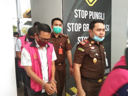 Kelima orang tersangka digiring jaksa ke mobil tahanan sekitar pukul 15.00 WIB. Mengenakan jaket pink bertuliskan ‘tahanan’ kelima tersangka bersamaan keluar dari ruang aula Kejari menuju pelataran parkir Kejari Kuantan Singingi