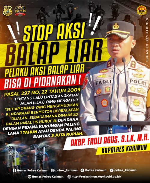 Selain memberikan himbauan, Polres Karimun beserta Polsek jajaran juga mengajak masyarakat Kab. Karimun untuk mengawasi dan mencegah balapan liar dan segera melaporkan ke Polres Karimun jika mengetahui atau menemukan adanya balap liar, Polres Karimun juga memberlakukan tindakan tegas terhadap pengguna knalpot brong yang menghasilkan suara bising yang mengganggu ketenangan masyarakat.