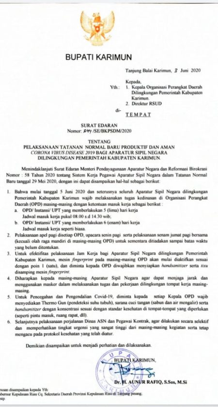 Berikut surat edaran Bupati Karimun Aunur Rafiq yang diterima melalui Kabag Humas Pemkab Karimun, Didi Irawan, (4/6) malam. Surat Edaran Bupati Karimun, Nomor 334/SE/BK/BKPM/2020 , Tanggal 3 Juni 2020 Tentang Pelaksanaan Tatanan Normal Baru Produktif dan Aman Corona Virus Disease 2019 Bagi Aparatur Sipil Negara di Lingkungan Pemerintah Kabupaten Karimun.