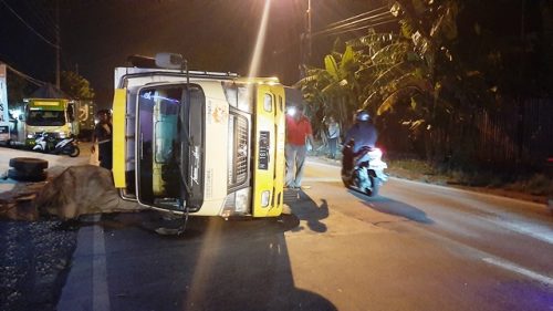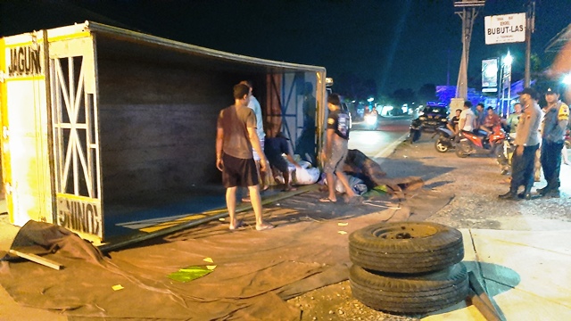 “Kejadiannya as roda belakang truk patah, sehingga truk terguling,”ucap Ngadiyanto teman sang sopir.