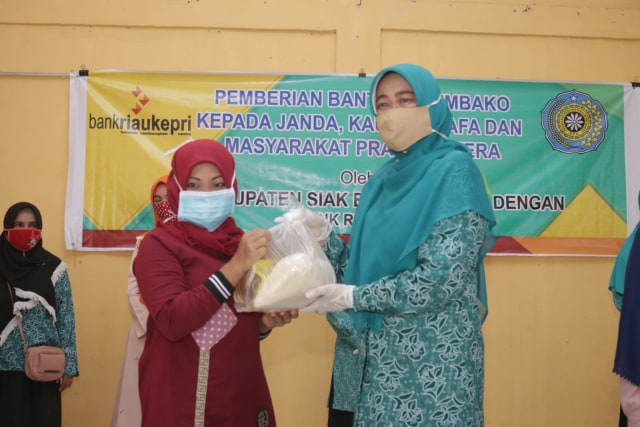 KARIMUNTODAY.COM, SIAK – Tim Penggerak Pemberdayaan Kesejahteraan Keluarga (PKK) Kabupaten Siak bekerjasama dengan Bank Riau Kepri Cabang Siak menyerahkan bantuan paket sembako kepada kaum dhuafa, janda tua, dan fakir miskin di Kecamatan Koto Gasib dan Bungaraya.