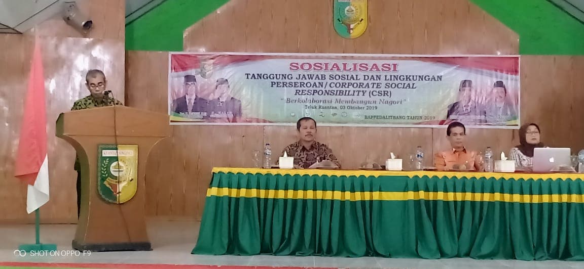KARIMUNTODAY.COM, TELUK KUANTAN – Bupati Kuantan Singingi H.Mursini Membuka secara langsung acara sosialisasi tanggung jawab sosial lingkungan di gedung Narosa Teluk Kuantan kabupaten Kuantan Singingi Provinsi Riau Kamis (3/10/2019),Hadir pada kesempatan ini bupati Kuansing Drs.H.Mursini,M.si, Sekda Kuansing DR.Dianto Mampanini,SE.MT, kepala OPD,Camat sekabupaten Kuantan Singingi dan 35 Perwakilan perusahaan serta perbankan sekabupaten Kuansing.