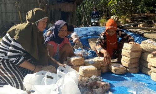 Warga kampung bergotong royong dan membungkus daging kurban tersebut untuk dimasukkan ke dalam besek yang terbuat dari anyaman bambu dan kantong plastik untuk kemudian dibagikan ke rumah-rumah warga di kampung terbut.
