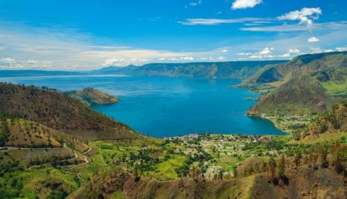 Kaldera Toba yang terbentuk dari ledakan super volkano 74.000 tahun lalu memiliki dasar yang sepenuhnya air sehingga menciptakan danau terbesar di Indonesia.