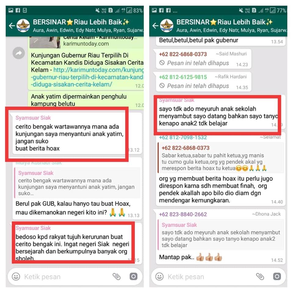 Gubernur Riau terpilih, Drs H Syamsuar, yang kini masih menjabat sebagai Bupati Siak angkat bicara namun sayangnya dengan nada tinggi dan seakan menyudutkan awak media ini sendiri. Hal ini terungkap melalui Grup WhatsApp “Bersinar Riau Lebih Baik” .