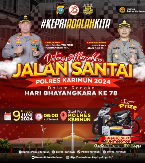 KARIMUNTODAY.COM, KARIMUN – Polres Karimun bersiap memeriahkan Hari Bhayangkara ke-78 dengan menggelar kegiatan jalan santai yang akan diselenggarakan pada hari Minggu, tanggal 09 Juni 2024, pukul 06.00 WIB, acara ini akan dilangsungkan di Polres Karimun dan yang lebih menggembirakan, kegiatan ini terbuka untuk partisipasi seluruh masyarakat umum dan banyak doorprize dengan hadiah utama yaitu satu unit sepeda motor. Jumat (07/06/2024).