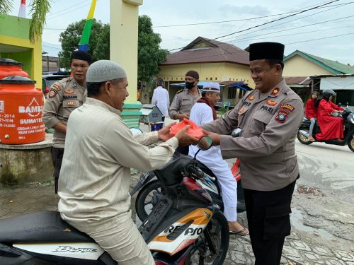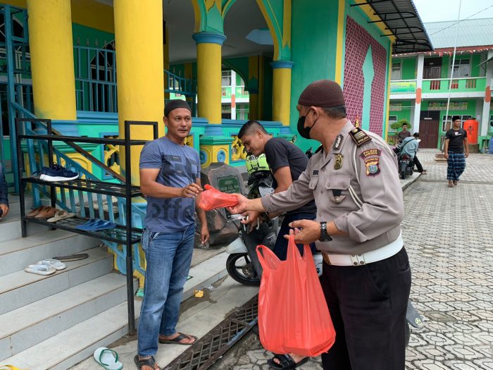 Suasana personil Polsek Balai membagi-bagikan nasi bungkus kepada jamaah Masjid Nurul Huda belakang Imigrasi, Jl.Ahmad Yani ,Kel.Sungai Lakam Kec.Karimun, Kab. Karimun, Jum’at (21/10/2022).