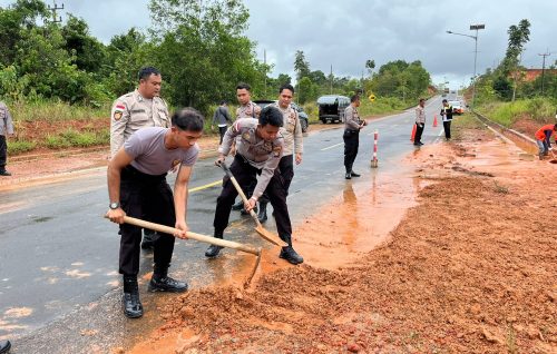 Personil Polres Bintan dari Satuan Samapta bersama-sama dengan Dinas Pekerjaan Umum Kabupaten Bintan membersihkan jalan dan parit tersebut sehingga jalan tersebut yang semula dipenuhi lumpur setelah dibersihkan tidak ada lagi genangan air dan genangan lumpur sehingga dijalan tersebut sudah aman dilalui oleh pengendara.