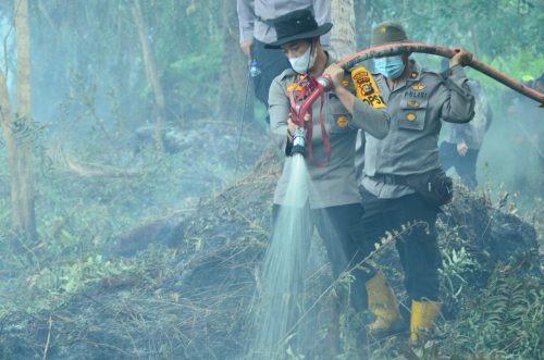 Kapolres Inhil Turun Lansung Melakukan Pendinginan Pada Lahan Yang Terbakar