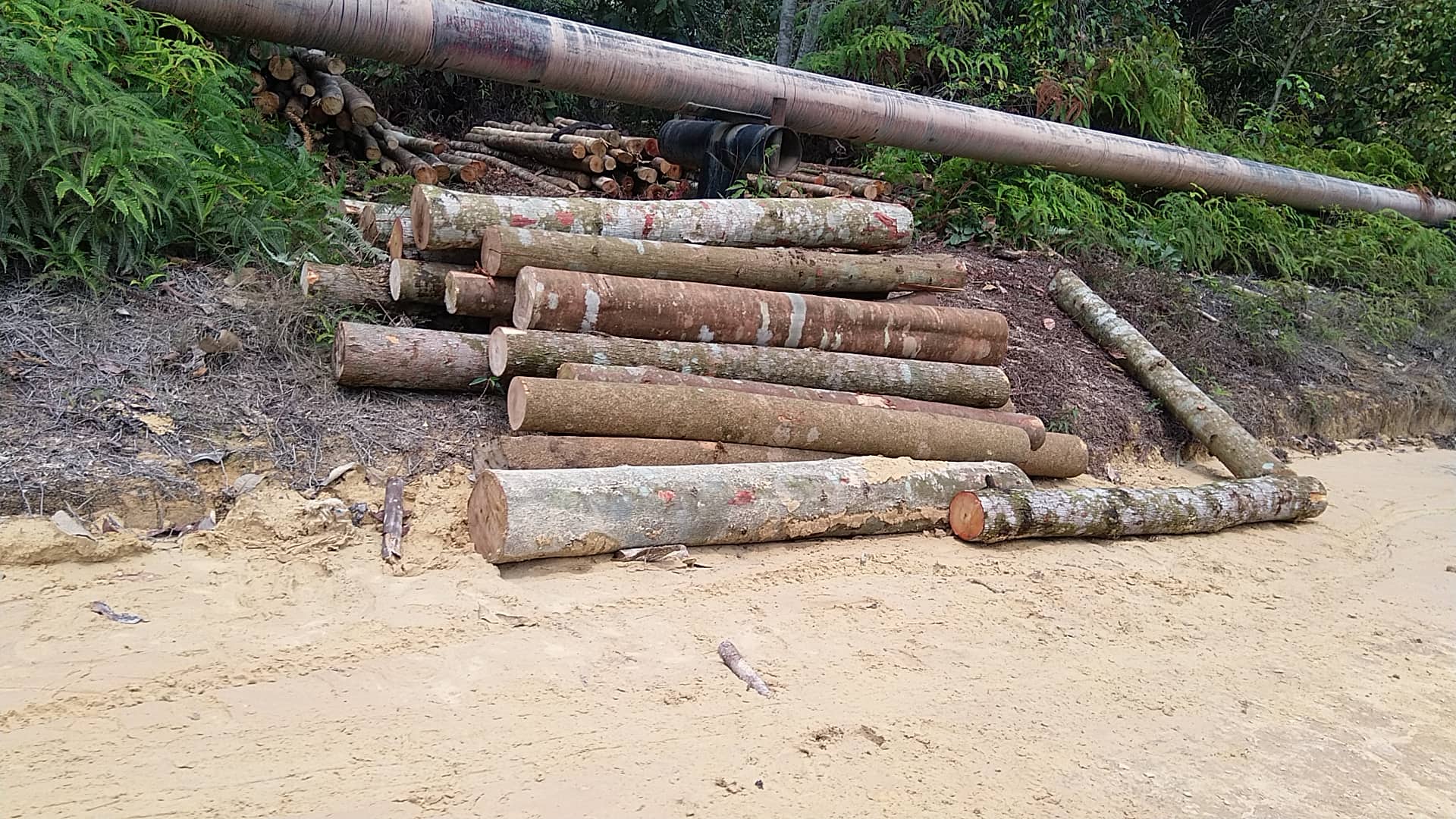 Di sisi lainnya terlihat pula adanya aktifitas penebangan kayu alam menggunakan mesin singso yang dilakukan oleh sejumlah orang tak dikenal (OTK), kemudian terlihat kayu-kayu itu ditumpuk ditepi jalan disinyalir akan dimuat menggunakan mobil truk.