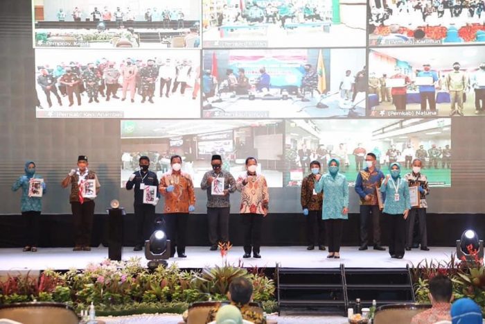 Kegiatan tersebut juga dihadiri langsung oleh Pjs Wali Kota Batam, Syamsul Bahrum dan seluruh kepala daerah di Kepri. Sementara Sekda Kota Batam, Jefridin bersama Forkompinda Kota Batam menyaksikan melalui video conference di Kantor Wali Kota Batam, selanjutnya dilakukan serentak penyerahan masker untuk perwakilan Tim Penggerak PKK, anggota pramuka, pengurus karang taruna, TNI dan Polri.(*/r)