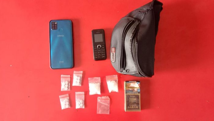 Lanjut pak kasi, Kemudian setelah itu, tersangka ditangkap dan diamankan dan kemudian dilakukan pencarian barang tersebut dan ditemukan barang berupa 1 (satu) buah kotak rokok dan 1 (satu) bungkus plastic, dan setelah itu dibuka dihadapan tersangka dan 1 (satu) buah kotak rokok tersebut berisi 2 (dua) bungkus plastic klip transparan yang berisi serbuk Kristal warna putih diduga narkotika jenis shabu dan 1 (satu) bungkus plastic tersebut berisi 4 (empat) bungkus plastic klip yang berisi 20 (dua puluh) butir pil warna pink diduga narkotika jenis extacy.
