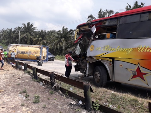 Pantauan awak media tampak dibagian kepala mobil Bus tersebut ringsek parah dari sebelah kiri, pasca menabrak tanki BULKHAUL itu, pihak kepolisian unit lantas Polsek Kandis pun tampak sudah berada di lokasi kejadian, guna mengamankan laka tersebut.