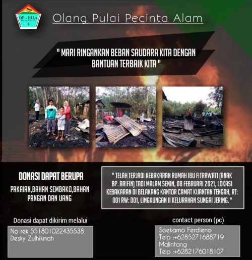 Terkait hal ini, Ketua Komunitas Olang Pulai Pecinta Alam (OP-PALA) Andry Marty Supardy mengajak seluruh lapisan masyarakat untuk membatu sauara kita yang terkena musibah, mari saling bahu membahu memberikan bantuan kepada korban agar dapat meringatkan Benan ibu Fitra wati.