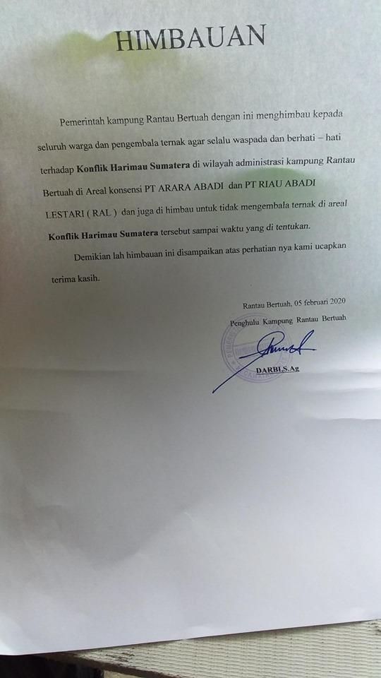 Dalam surat yang dibuatnya itu Pemerintah Kampung Ranatu Bertuah menghimbau kepada seluruh warga dan pengembala ternak agar selalu waspada dan berhati-hati terhadap konflik Harimau Sumatra di wilayah administrasi Kampung Rantau Bertuah khususnya di areal Konsensi PT Arara Abadi (PT AA) dan PT Riau Abadi Lestari (PT RAL- Sinarmas grup) dan juga dihimbau agar tidak mengembala ternak di areal konflik Harimau Sumatra tersebut sampai waktu yang ditetapkan.