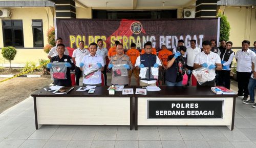 Dari hasil pengungkapan kasus, telah diamanakan 4 (Empat) tersangka setelah petugas melakukan penyelidikan dan penyidikan sehingga mencium keberadaan para terduga pelaku yang bersembunyi di daerah Kota Medan, ujar Kapolres Sergai AKBP Jhon HR Sitepu, S.IK, M.H., saat konferensi pers bersama, Kasat Reskrim Iptu Binrod Situngkir, Kasatres Narkoba AKP Arif Suhadi, Kasi Humas Iptu LB Manullang, KBO Satreskrim Iptu Zulfan Ahmadi, di depan Lobi Mako Polres Sergai Jalan Negara, Desa Firdaus Kecamatan Seirampah Kabupaten Sergai – Sumut, pada Kamis (25/09/2025) sekira pukul.11.00 WIB.