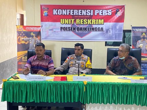 Kapolres Lingga AKBP Fadli Agus, S.I.K., M.H. melalui Kapolsek Daik Lingga AKP Idris, S.E., Sy., M.H. pimpin kegiatan konferensi pers didampingi oleh Kabag Ekonomi Kab. Lingga Yulius, S.Km., Kanit Reskrim Polsek Daik Lingga Brigadir Yosman Ganda Tua Simangunsong serta dihadiri awak media.