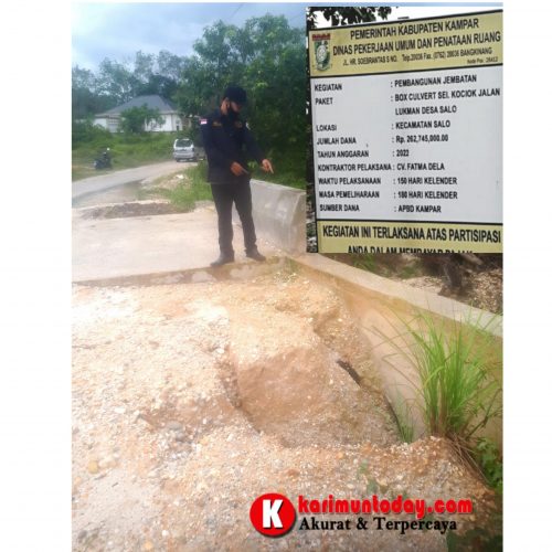 KARIMUNTODAY.COM, KAMPAR – Proyek pembangunan Box Culvert jembatan yang beralokasikan di sungai Kociak Jalan Lukman Desa Salo Timur, Kecamatan Salo, Kabupaten Kampar, Provinsi Riau, disinyalir tidak sesuai spesifikasi dan dibuat hanya asal-asalan.