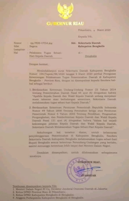 “Dalam hal terjadi kekosongan jabatan Kepala Daerah dan Wakil Kepala Daerah, Sekretaris Daerah melaksanakan tugas sehari-hari Kepala Daerah”. Berpijak pada hal tersebut, dalam salah satu alinea surat tersebut, Gubri Syamsuar mengatakan, “untuk kelancaran penyelenggaraan pemerintahan di Kabupaten Bengkalis, Saudara Sekretaris Daerah Kabupaten Bengkalis melaksanakan tugas sehari-hari Bupati Bengkalis sesuai ketentuan peraturan perundang-undangan yang berlaku, sambil menunggu ketentuan lebih lanjut dari Menteri Dalam Negeri.”