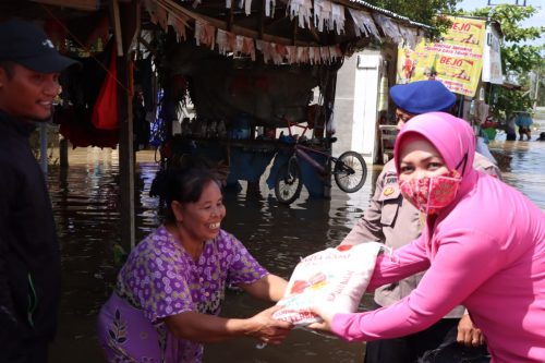 Selanjutnya Ketua Bhayangkari Cabang Sergai dgn didampingi oleh Kapolsek Firdaus, Kasat Pol Airud dan pengurus Bhayangkari melakukan pengecekan ke rumah – rumah yang terkena banjir dengan menggunakan perahu karet milik Satpol Airud Polres Sergai serta membagikan bantuan sebanyak 50 (Lima puluh) karung beras dan telur 10 (Sepuluh) papan kepada warga yang terkena banjir.