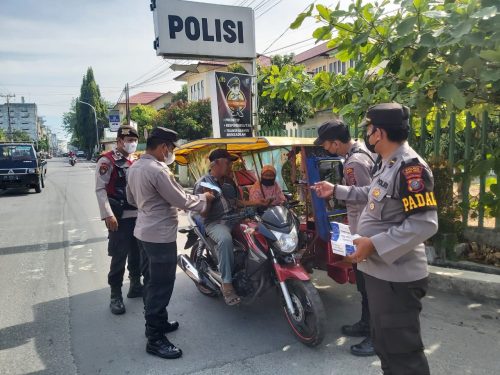 Pelaksanaan Operasi Yustisi Perpanjangan Pemberlakuan Kegiatan Masyarakat yang melintas pengguna kendaraan R.2, R.3, R.4 dan pejalan kaki yang melintas di Pahlawan Kota Tebing Tinggi, personil membagikan masker terhadap masyarakat yang tidak menggunakan masker berjumlah 40 orang, dan personil memberikan himbauan agar selalu menerapkan Protokol Kesehatan 5M. (MS)