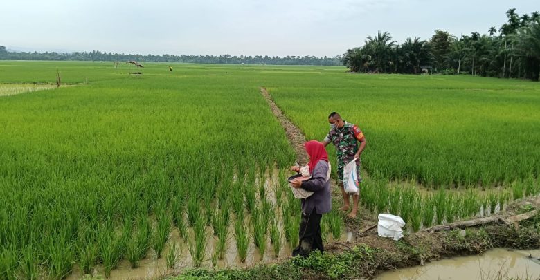 Babinsa Bantu Petani Tabur Pupuk di Sawah Wujudkan Ketahanan Pangan