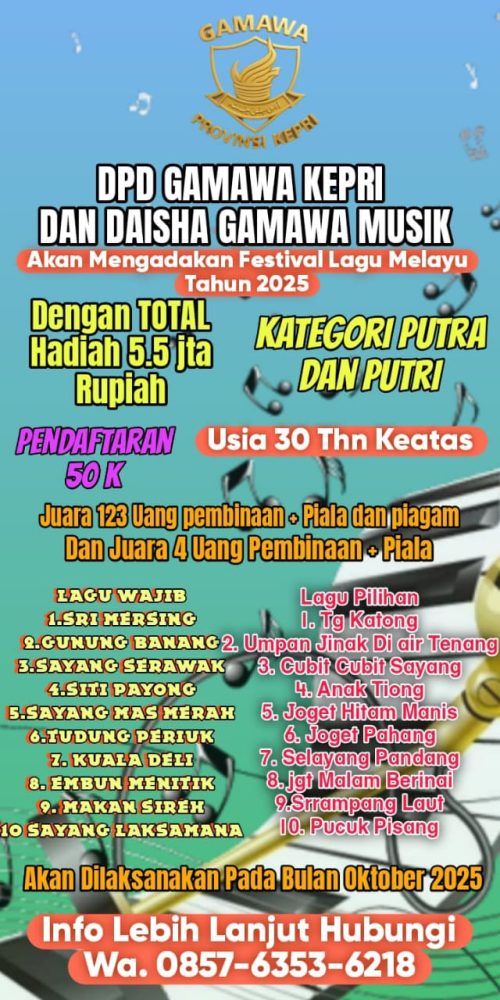 KARIMUNTODAY.COM, KARIMUN – Bertempat di Warkop ( Warung Kopi ) Sri Gamawa Blok B. Costral Area, dalam rangka menyambut HUT ( Hari Ulang Tahun ) Kabupaten Karimun Yang Ke 26, DPD Gamawa Kepri dan Dhaisa Gamawa Musik bekerja-sama dengan Pemkab ( Pemerintah Kabupaten ) Karimun. Selasa Malam ( 07/10 ) akan membuka Festival Lagu Melayu, yang direncanakan akan dihadiri oleh Bupati Karimun H. Ing Iskandarsyah dan Wabup Rocky Marciano Bawole.