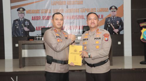Selanjutnya Kapolres Lingga AKBP Apri Fajar Hermanto, S.I.K dan AKBP Robby Topan Manusiwa S.I.K., M.H. Melaksanakan kegiatan Penandatanganan memory serah terima jabatan yang dilaksanakan di gedung Endra Dharma Laksana Polres Lingga.