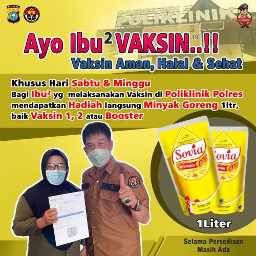 “Semua jenis vaksin ada di Klinik Polres Inhil jalan Sudirman Tembilahan depan Masjid Al Huda. Mau vaksin pertama, kedua, ketiga silahkan gratis dengan hanya membawa KTP. Selain untuk kesehatan, setiap orang yang divaksin juga dapat minyak goreng 1 liter gratis dari kami, semakin banyak bawa keluarga semakin banyak dapat minyak goreng,” paparnya.