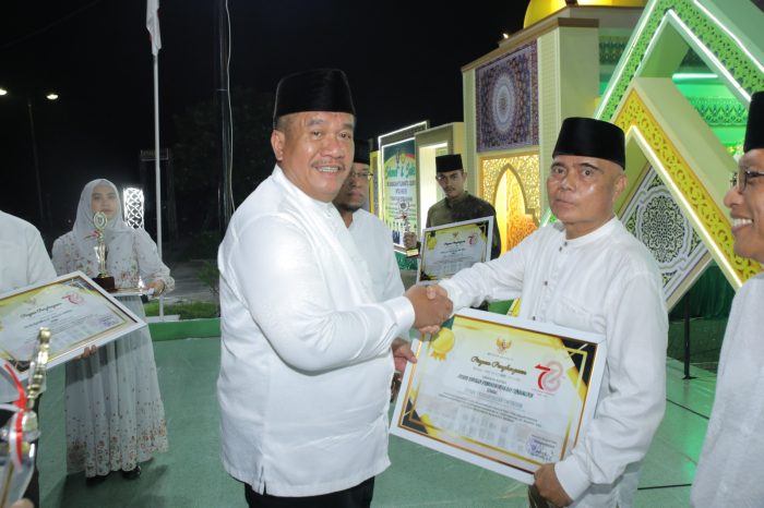 Wakil Bupati Asahan Taufik Zainal Abidin Siregar, S. Sos, M. Si. tengah memberikan i hadiah berupa piagam penghargaan, trophy dan uang tunai.